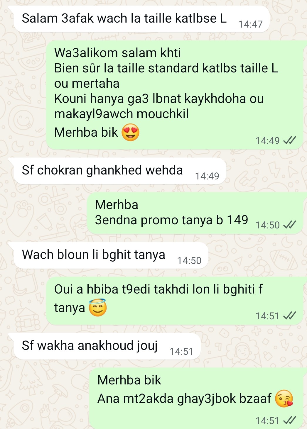 أكيد! عندنا سياسة ارجاع المنتوج كاتشوفي عاد تخلص ليفرور او يمكن لينا نبدلوه لك فمدة ثلاثة ايام (ملحوظة ان المنتج يبقى كيما توصلتي به او تاكد من المقاس ديالك منقبل)